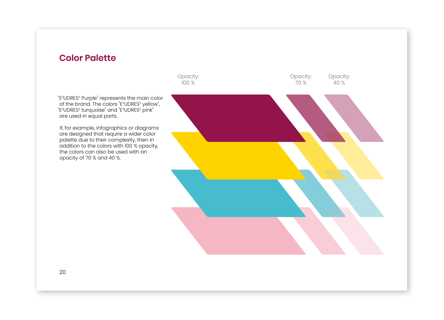 Für zusätzliche Spannung in der visuellen Aufmachung sorgt der Einsatz von frischen knalligen Farben, deren Spektrum die Diversität von E³UDRES² widerspiegelt. Insbesondere hierbei musste darauf geachtet werden, dass trotz der starken Unterschiede zwischen den Farben ein stimmiges Gesamtbild gezeichnet wird, welches weiterhin einen bestimmten wissenschaftlichen Touch besitzt.